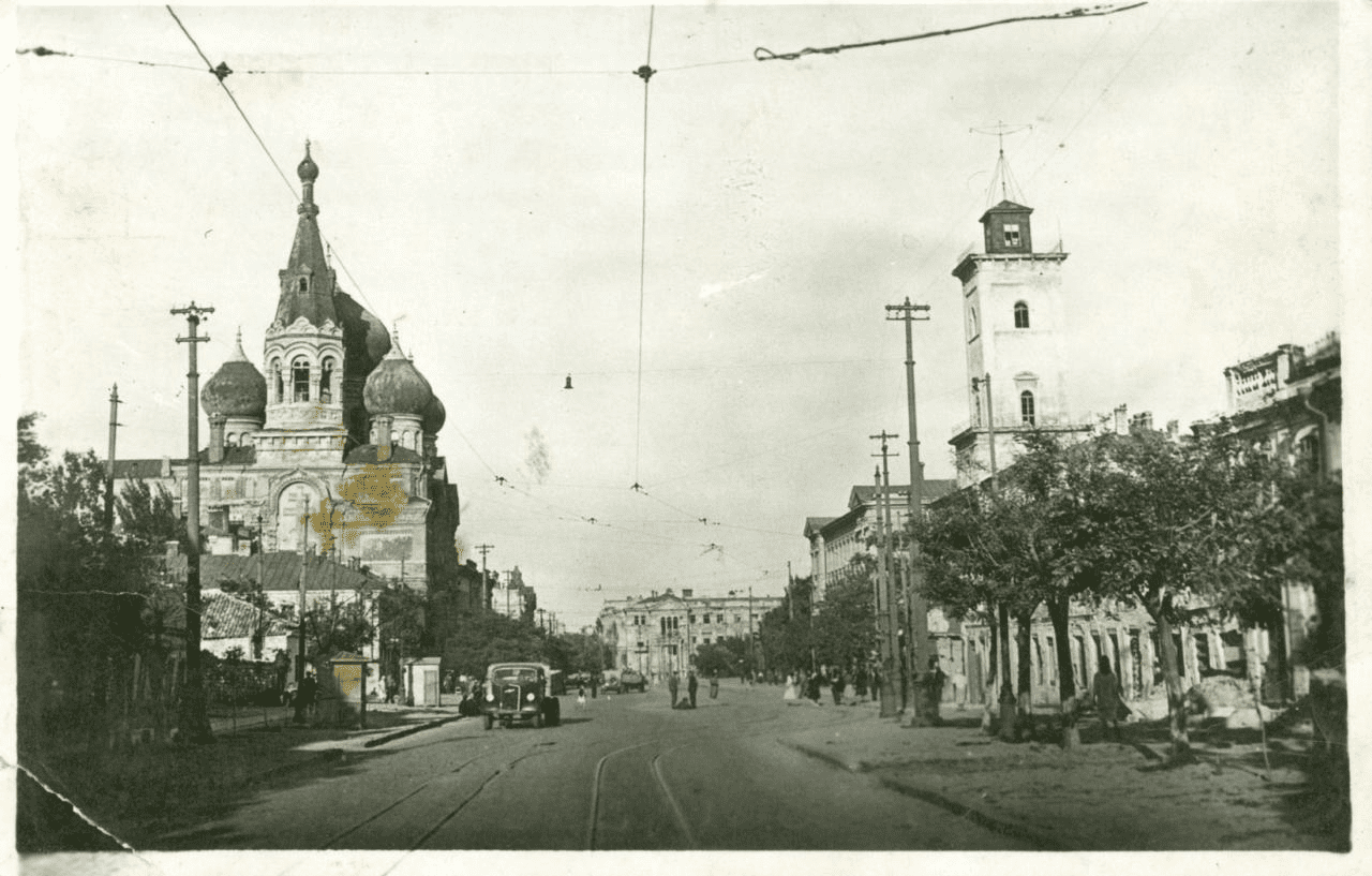 Итак, в путь! Представим, что некий гость города оказался в районе сегодняшнего железнодорожного вокзала. Такое было вполне возможно, ибо уже в те далекие годы то было довольно посещаемое место с его достопримечательностями: “Привозом” и станцией железной дороги. Желая попасть в центр города, турист садился в вагон Центральной линии конки. Как указывает справочник, конечная этого маршрута была около Афонского подворья, здания судебных установлений и … вокзала железной дороги, т.е. приблизительно на перекрестке улицы Пантелеймоновской и Лейтенанта Шмидта (в те годы — Мещанской).